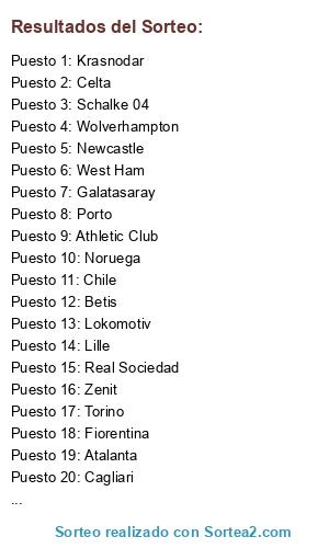 Lista de participantes: Aston Villa, Atalanta, Athletic Club, Benfica, Betis, Boca Juniors, Cagliari, Celta, Chile, Fiorentina, Flamengo, Galatasaray, Krasnodar, Lille, Lokomotiv, Newcastle, Noruega, Porto, Real Sociedad, River Plate, Saint-Étienne, Schalke 04, Shakhtar Donetsk, Torino, Villarreal, West Ham, Wolverhampton, Zenit.