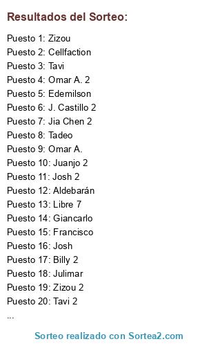Lista de participantes: Alberto, Alberto 2, Aldebarán, Aldebarán 2, Andres, Andres 2, Billy, Billy 2, Cellfaction, Cellfaction 2, David P., David P. 2, Edemilson, Edemilson 2, Francisco, Francisco 2, Giancarlo, Giancarlo 2, Gonza, Gonza 2, J. Castillo, J. Castillo 2, J.L.Cuevas, J.L.Cuevas 2, Jia Chen, Jia Chen 2, Josh, Josh 2, Juanjo, Juanjo 2, Julimar, Julimar 2, Lucky, Lucky 2, Luis Martinez, Luis Martinez 2, Omar A., Omar A. 2, Raul, Raul 2, Raymundo, Raymundo 2, Tadeo, Tadeo 2, Tavi, Tavi 2, Zizou, Zizou 2, Libre 1, Libre 2, Libre 3, Libre 4, Libre 5, Libre 6, Libre 7, Libre 8, Libre 9, Libre 10.