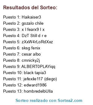 Lista de participantes: huachalomo, schacon2, khokhe00, xilendcorazon, atogod 80, shilenooo, calota, monogorn, VET3RINARI0, sirfrank1978, juandres28, matias18, x mikun x, .