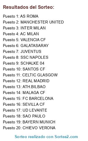 Lista de participantes: ATH.BILBAO, FC BARCELONA, BAYERN MUNICH, CELTIC GLASGOW, CHIEVO VERONA, GALATASARAY, INTER MILAN, JUVENTUS, UD LEVANTE, REAL MADRID, MALAGA CF, MANCHESTER UNITED, AC MILAN, SSC NAPOLES, AS ROMA, SANTOS CF, SAO PAULO, SCHALKE 04, SEVILLA CF, VALENCIA CF.