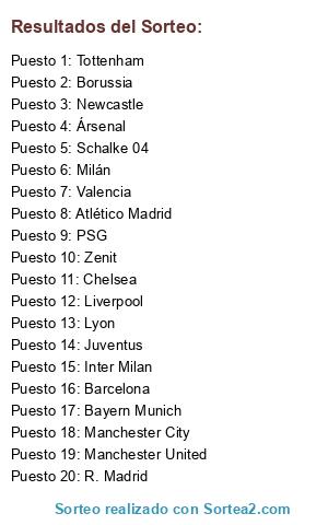 Lista de participantes: Barcelona, R. Madrid, Manchester City, Bayern Munich, Manchester United, Chelsea, Atlético Madrid, Lyon, PSG, Ársenal, Juventus, Tottenham, Borussia, Inter Milan, Valencia, Milán, Zenit, Liverpool, Newcastle, Schalke 04.