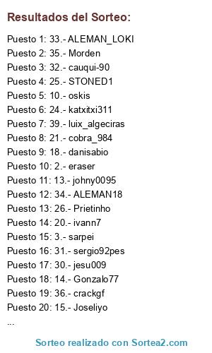 Lista de participantes: 1.- peperecre, 2.- eraser, 3.- sarpei, 4.- DAVTRE, 5.- altec182, 6.- ivan95pes, 7.- Belce, 8.- chustamante, 9.- alejandro20, 10.- oskis, 11.- johny21, 12.- kukamora, 13.- johny0095, 14.- Gonzalo77, 15.- Joseliyo, 16.- Ruli12, 17.- albertov6, 18.- danisabio, 19.- epiniano, 20.- ivann7, 21.- cobra_984, 22.- marucho, 23.- crt-leo10, 24.- katxitxi311, 25.- STONED1, 26.- Prietinho, 27.- nhygren, 28.- ExOn_ToGa, 29.- fortopeta, 30.- jesu009, 31.- sergio92pes, 32.- cauqui-90, 33.- ALEMAN_LOKI, 34.- ALEMAN18, 35.- Morden, 36.- crackgf, 37.- ismajimva, 38.- javi_v_m, 39.- luix_algeciras, 40.- wladi.