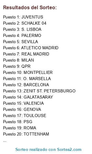Lista de participantes: REAL MADRID, BARCELONA, MNCHESTER CITY, PSG, CHELSEA, MANCHESTER UNITED, INTER MILAN, MILAN, ARSENAL, JUVENTUS, LIVERPOOL, BAYERN MUNICH, NAPOLES, TOTTENHAM, FIORENTINA, ATLETICO MADRID, VALENCIA, O. MARSELLA, O. LYON, SEVILLA, LAZIO, OPORTO, BENFICA, GALATASARAY, FENERBAHCE, ROMA, ATHLETIC BILBAO, MALAGA, S. LISBOA, SCHALKE 04, ASTON VILLA, UDINESE, ZENIT ST. PETERSBURGO, QPR, PALERMO, GENOVA, TOULOUSE, LILLE, MONTPELLIER, NEWCASTLE.