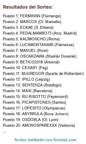 Lista de participantes: FERMINNN (Flamengo), RAIVEN (Ac Milan), EMILIO UCHA (Racing Club), R. CUERVO (S. Lorenzo), ECKAE (S. Ettiene), OSDOBLA (Ol. Lyon), MARCOS (Ol. Marsella), IPILLO (Leipzig), LUIZAO (Ajax), LOPESITO (Olympiacos), OZORA (Benfica), SENTENZA (Botafogo), AMONOSPAREXXX (Valencia), CAPELINHO (B. Dortmund), CEXAR1 (Psg), OSCARZAWA (Shaktar Donetsk), PADRONE (Zenit), IBORRA (Napoles), SULLENDONKEY (Schalke), MAXI (Barcelona), KALIMONCHO (Roma), MINDIX (Liverpool), MANUEL (River), SEGO (Monaco), BETICO2018 (Arsenal), PICAPISTONES (Santos), PEDALMAMBO73 (Atco. Madrid), LUCAMONTANA85 (Palmeiras), McGREGOR (Sparta de Rotterdam), PEPELU75 (Ado Den Haag), ABYRRULA (Boca Juniors), RU RISOTTO (Feyenoord).