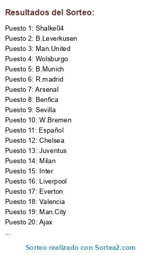 Lista de participantes: Tottenham, Arsenal, Chelsea, Liverpool, Man.United, Man.City, Everton, R.madrid, Barça, Sevilla, Español, Valencia, B.Munich, Wolsburgo, W.Bremen, B.Leverkusen, Shalke04, Inter, Milan, Juventus, Csk Moscú, Ajax, Benfica.