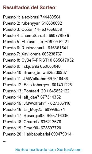 Lista de participantes: Esparta087 - 670403017, JMWolfrahm - 627386116, Felixitoborges- 601401225, Rubiodepaul - 616361541, Drser90- 678597720, Bruno_bmw 625839937, alex-brasi 744480504, CyBeR-PRiST10 635647032, Er_Mey23 609985371, alf_dae7 677314352, Habbababarisi 699479014, JMWolfrahm 697518436, Kevin8128287/ 697300099, JaumeSarrat - 660779876, Pontaeri_20 / 645852122, Cobom14- 637666539, Churrofx-636213676, rubenyyuri 618688692, Fcbjuanlu 660868040, Xavilorena 665238767, Ivanpiro 657763397, El_ruso_tito 609 09 62 21, Rosergio88. /695716036.