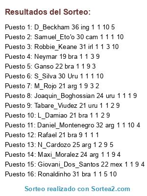 Lista de participantes: Daniel_Montenegro 32 arg 1 1 10 4, Rafael 21 bra 9 1 1 1, Ganso 22 bra 1 1 9 3, Neymar 19 bra 1 1 3 9, Ronaldinho 31 bra 1 1 5 10, L_Damiao 21 bra 1 1 2 9, D_Beckham 36 ing 1 1 10 5, Robbie_Keane 31 irl 1 1 3 10, N_Cardozo 25 arg 1 2 9 5, Joaquin_Boghossian 24 uru 1 1 1 9, Samuel_Eto'o 30 cam 1 1 1 10, Giovani_Dos_Santos 22 mex 1 1 9 4, M_Rojo 21 arg 1 9 3 2, S_Silva 30 Uru 1 1 1 10, Maxi_Moralez 24 arg 1 1 9 4, Tabare_Viudez 21 uru 1 1 2 9.