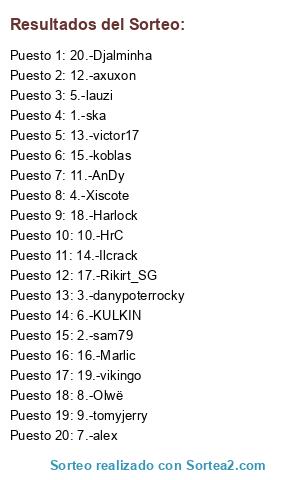 Lista de participantes: 1.-ska, 2.-sam79, 3.-danypoterrocky, 4.-Xiscote, 5.-lauzi, 6.-KULKIN, 7.-alex, 8.-Olwë, 9.-tomyjerry, 10.-HrC, 11.-AnDy, 12.-axuxon, 13.-victor17, 14.-Ilcrack, 15.-koblas, 16.-Marlic, 17.-Rikirt_SG, 18.-Harlock, 19.-vikingo, 20.-Djalminha.