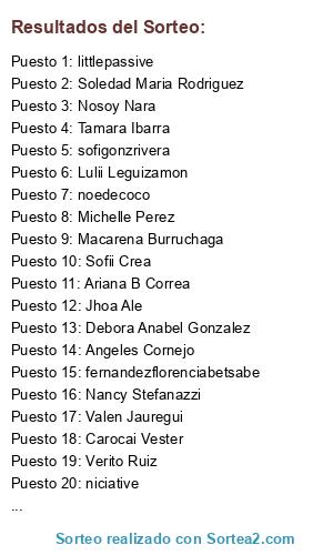 Lista de participantes: Carlos Sànchez, Damian Gonzalez, Alejandra Nuñez, Cintia Canedo, Florentino Ramirez, Maria R Quintana, Mary Kay Zarate, Debora Mariana Ruiz, Cecilia Ramirez, Alby Cabral, Gisela Paola Sueldo, Vanesa Miranda, Anto Heredia, Mirian Cardozo, Veronica Quinteros, Danyela Rizzo, Noe Mar, Romina Anabel Chirico, Sandez Brisa, Yuranis Arley Benítez Atencia, Ana Da Rosa, Johanna Espíndola, Romina Correa, Romina Castel, Marroxs Mauro, Vivian Constela, Rosalia Cabral, Estela Mary, Floor Nardi, Laura Alicia, Antonella Ceglia, Celeste Mancel, Celeste Piris, Looli Biebs, Daisy Melgarejo, Ericka Montenegro, Julieta Laura Crespi, Graciela Valdéz, Fuego Agua, Estefania Lopez, Sara Peña, Ariana B Correa, Leila Romero, Diana Q Condori, Arianna Campo, Maria Victoria, Eli Spadaro, Euge Chan, Cris Tel, Deby Maru Ruiz, Patto Liam, Florencia Messa, Estefi Nya, Catalina Kyu, Macarena Ayzemberg, Pauu LI, Caro Belleggia, Sara Snow, Laura Vega, Nana Black, Florencia Moyano, Solis Ale Mariela, Angeles Cornejo, Mariela Marchant de Barragan, Carocai Vester, Martina Carrizo, Noelia Martinez, Georgina Giarrosso, Vilma Diaz Santacruz, Macarena Gonzalez, -, Andrascik Maria Soledad, Dina Quispe, Romi Bosco, Magali Jerez, Sandra Salcedo, Florencia Gabriela Albamonte, Gabi Vallica, Sofii Crea, Lali Gonzalez, Michelle Perez, Florencia Cantore, Gise Carp Rodriguez, Flor Puyol, Evy Pérez, Beatriz Palacios, Yanet Tonioli XD, Paula Soledad Nieto, Mica Espínola, Mica Brining, Lule Ichouribehere, Yoha Nietzsche, Adri Diaz, Koska Mily Cortez Calleja, Melany Abregú, Merlina Ledesma, Soledad Garcia, Romina Orellana, Chem Lamoise, Flor Pereira, Camu Correa, Mariela Alarcon, Yamileth Cecilia Leon Camacho, Caroo Condori, Jhoa Ale, Garcia Yamila, Jimena Agüero, Sol Lugones, Florencia Selene, Belu Rasgido, Roo Santucho, Lulii Leguizamon, Rocio Ovando, Sara Ines Toti, Marisa Boccalatte, Carolina Bosque, Daniela Sosa, Day Riot, Celes Lucero, Caro Bernat, Lemon Dropx, Laura Beatriz Dietz, Griselda Llano, Silvana Ivanova, Yanina Contreras, Nadis Rojas, Veronica Cramaro, Maria Laura Poggio, Nosoy Nara, Silvia Bar, Ari Goncebat, Viicky Rivas Scuri, Valen Jauregui, Belen Rodriguez, Mika Gordillo, Romi Sibulofsky, Silvina Insaurralde, Cici Cuesta, Agustina Ballina, Ala de Mariposa, Pamela Prieto, Verito Ruiz, Violee Stark, Olga Baldera Nuñez, Sole Medina, Ro Barrios, Tatiana Rose, Soledad Maria Rodriguez, Regi Marcelli Benintende, Victoria Mathurin, Yami Romero, Elina Telaina, Florencia Bottor, Lujan Juarez, Evelyn Solange Moldes, Aldana Ge, Meli Avakian, Adriana Franco, Diani Etxániz, Karina Alejandra Sedani, Tamara Ibarra, Maria Carmen Bustamante, Juani Reategui, Gisela Herrera, Cinthia Rodriguez, Delfina Perez, Daniela Romina De Laforé, Soff Soledad Sebo, Maria Fernanda Zalazar, Fucsia Barros, Graciela Dipasquale, Gabriela Romo, Nancy Stefanazzi, Noelia Barrera, Claudia Norma Piris, Chachi Aguirre, Sofi Fontan, Ramona Poggio, Soledad Berardi, Patricia Gonzalez, Alvaro Florit, Cande Ruiz, Dafna Ferdman, Debora Anabel Gonzalez, Micaela Yamila Sandez, Nora Rocío, Sofi Gonzalez Rivera, Norma Ines Cramaro, Anii Iriarte, Isa Macagno, Yamila F. Medina, Lali Estrella, Florencia Torre, Giani Ramo, Noelia Sandoval, Taty Tep, Jesica Valeria, Sofia Chochi, Veronica Ascanio, Mirt Gonzalez, Marcela Garcia, Pao Reynoso, Ana Garcia, Aracely Merida Cortez, Julieta Rivero, Sol Rodríguez, Macarena Burruchaga, Rochi Rukia Vignolles, niciative, lourdesmartinn_, moonlight__blog, yamflom, eliiiz87, beautyfloblog, burguenet, delfinmatias, noeliacuevxs, moniarmua, cintiamacchimakeup, poggiomaria, saeko_atori, agostinachierri, dayi_de_florsta, littlepassive, Paula Curet MUA, cande.ruiz27, nora_barrias, sexilialeon91, mimi.2228, sofigonzrivera, steffydith, abeleraansh, albycabral, leilacasalena, marrox_s, sofiagalaxy26, caroocondori, xgomitadeazucar, fernandezflorenciabetsabe, mikagordillo97, romi_sibulofsky, macarenagbb, Macarena, ivanovasilvana, juaanii13, sol_berenice, noedecoco.