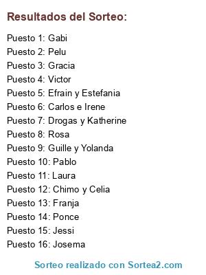 Lista de participantes: Rosa, Drogas y Katherine, Jessi, Guille y Yolanda, Pablo, Carlos e Irene, Gracia, Victor, Ponce, Gabi, Josema, Chimo y Celia, Laura, Franja, Pelu, Efrain y Estefania.