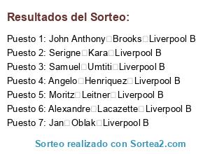 Lista de participantes: Alphonse Areola Liverpool B, Jan Oblak Liverpool B, Francesco Bardi Liverpool B, Alexander Kacaniklic Liverpool B, Jordan Henderson Liverpool B, Alessandro Florenzi Liverpool B, Ross Barkley Liverpool B, Serigne Kara Liverpool B, Panagiotis Tachtsidis Liverpool B, Wilfried Zaha Liverpool B, Moritz Leitner Liverpool B, Georgi Schennikov Liverpool B, Jetro Willems Liverpool B, Omar Elabdellaoui Liverpool B, Federico Cartabia Liverpool B, Pavel Solomatin Liverpool B, John Anthony Brooks Liverpool B, Steven Caulker Liverpool B, Jannik Vestergaard Liverpool B, Samuel Umtiti Liverpool B, Hervin Ongenda Liverpool B, Angelo Henriquez Liverpool B, Ante Vukusic Liverpool B, Alexandre Lacazette Liverpool B.