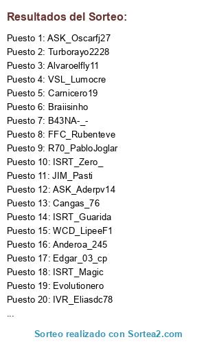 Lista de participantes: ISRT_Magic, R70_AndresAG, Alejandro_es_02, XxJose-OrenesxX, Javier_vera02, ISRT_JoseLopez, SRB_FVC, FFC_Sennalauda12, FFC_Robert, Edgar_03_cp, Braiisinho, Jorpa-szn, FFC_Rubenteve, MRO_Tonecho, SRB_Sito, B43NA-_-, ISRT_Alberto97, ISRT_Sergio_SSB, ISRT_Estivito16, Evolutionero, IVR_Eliasdc78, Cangas_76, ISRT_Zero_, Titanium__red, Alvaroelfly11, WCD_LipeeF1, Gualy27, Blizard-zhrax, Campanilla_pedro, R70_Soler, ASK_Oscarfj27, JIM-NardyPerez, JIM_Pasti, Da4id04, Anderoa_245, G123-456-A, VSL_Lumocre, ISRT_Guarida, R70_PabloJoglar, R70_Supermario, ASK_Aderpv14, Turborayo2228, VRG_Pepe, IVR_Marquez_F1, Carnicero19.