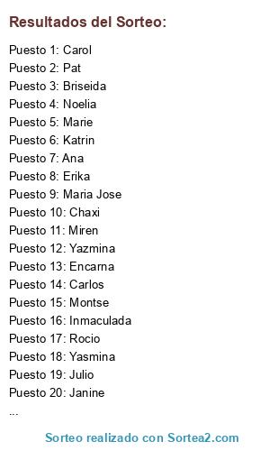 Lista de participantes: Carol(5 participaciones), Katrin, Janine, Miren(10 participaciones), Yazmina(3 participaciones), Pat(15 participaciones), Montse(15 participaciones), Briseida(10 participaciones), Emilia, Carlos(3 participaciones), Maria Eugenia(4 participaciones), Noelia(10 participaciones), Encarna(10 participaciones), Ana(30 participaciones), Maria Jose(5 participaciones), Erika(10 participaciones), Yasmina(2 participaciones), Rocio(3 participaciones), Helmer, Inmaculada(2 participaciones), Chaxi(5 participaciones), Julio(5 participaciones), Marie(15 participaciones).
