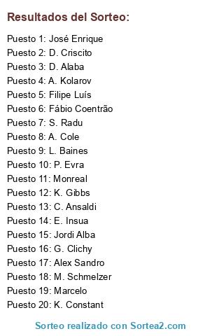 Lista de participantes: A. Cole, Marcelo, L. Baines, Jordi Alba, Filipe Luís, P. Evra, D. Alaba, G. Clichy, D. Criscito, Alex Sandro, Fábio Coentrão, José Enrique, M. Schmelzer, K. Gibbs, A. Kolarov, C. Ansaldi, S. Radu, E. Insua, K. Constant, Monreal.