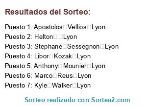 Lista de participantes: Rene Adler Lyon, Helton Lyon, Stephane Sessegnon Lyon, Javi Garcia Lyon, Fernando Reges Lyon, Cesc Fabregas Lyon, Cheik Tiote Lyon, Xabi Alonso Lyon, Alvaro Pereira Lyon, Kyle Walker Lyon, Adil Rami Lyon, Andre Ayew Lyon, Anthony Mounier Lyon, Holger Badstuber Lyon, Benedikt Howedes Lyon, Rolando Lyon, Sebastian Coates Lyon, Lukas Podolski Lyon, Luis Muriel Lyon, Emmanuel Emenike Lyon, Marco Reus Lyon, Libor Kozak Lyon, Mario Mandzukic Lyon, Apostolos Vellios Lyon.