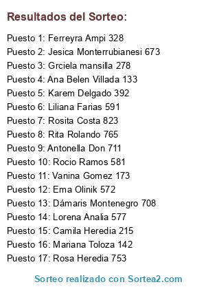 Lista de participantes: Carina Audagna 886, Valeria Vivas 924, Cecilia Demichelis 851, Antonella Don 711, Valentina Don 362, Brisa Parmigiani 563, Ema Olinik 572, Liliana Farias 591, Emilia Leguizamon 438, Soledad Carpio 673, Eliana Sosa 083, Cintia Carpio 345, Luciana JUAREZ 259, Melanie Vignolo 526, Gisela Yensen 583, Camila Heredia 215, Irma Saravia 378, Edith Arias 769, Verónica Galeano 027, Andrea castagno 791, Mariana Toloza 142, Lencinas Olga 012, Giordano Pamela 680, Sara Lopéz 959, Adriana Giorgis 464, Rocío Juárez 341, Martina Mangini 418, Vanesa Gigena 657, Nelida Tisera 975, Evangelina Garcia 547, Karina Mansilla 144, Yohana Semperez 227, Candela Rodríguez Cornejo 818, Clara Guevara 811, Melina Ballatore 319, Zulma Tostanosky,819., Ivana sosa 772, Lorena Delfino 297, Dámaris Montenegro 708, Aldana Ludueña 697, Gallardo Lucia 254, Gabriela noemi Antelo 535, Deolinda Aragon 360, Soraya Ferreira 618, Edith correa 018, Rocío kibrick 714, Rocío Irusta 792, Vanesa Cornejo 194, Lidia Alvarez 869, Marisa Álvarez 559, Fanny Juárez 859, Garrudo Maria 521, paulina romero 701, Soledad montes 479, Alicia ramallo 671, Florencia Pucheta 152, monicagallegos30172 604, Juliana Gimenez 109, Florencia Novarese 534, Graciela Lerda 297, Marianela Vaca 331, Marysol vaca 654, Silvana Peralta 192, Luciana Massimino 009, Agostina Olocco 630, Olga Taborda 773, Leonela Brochero 762, Agostina Gallegos 666, Graciela Delgado 321, Rocio Ramos 581, Martina Lencinas 473, Yoha Juárez 501, Vanesa spadachini 102, Fernanda Acosta Tulza 416, Rebeca Saru 987, Paulina Ludueña 575, Daniela Montenegro 749, Dana delgado 058, Anna Da Silva 759, Mariela Possetto 524, Flor Ramirez 410, Marisa Andini 769, Noelia Bertorello 987, Monje Ludmila 247, Frus Cabrera 051, Karem Delgado 392, Marisel Linares 846, Ana Belen Villada 133, Gladis Matur 424, Sabrina Imoberdof 565, Mirta Mariela Coronel 961, Micaela Giorgis Andrada 246, Abril Musso 225, Ferreyra Ampi 328, Belen Villada 133, Ludmila Montenegro 343, Alba Félix Chamillard 512, Romina Soledad villegas 972, Sonia de marco 878, Valentina Oreglia 393, Luciana Briggiler 254, Amalia Luna 066, Agostina Olocco 630, Silvia Balduzzi. 893, Lorena Maldonado 030, 857 Peralta Maricel, María José Ferreyra 145, Beatriz Arcari 214, Rosita Costa 823, Silvia Medrano 769, Alejandra Tolosa 377, Jessica Rodas Jara. 789, Cecilia Romero 780, Camila heredia 215, María Luisa Ferreyra 707, Tomasa vaca 885, Cecilia Delgado 389, María Elena Iturbide 394, Fernanda Tolosa 684, Emilia Leguizamón 438, Cristina Andino 409, Yanina letage 490, Sandra garnica 406, Marina vega 721, Susana Vitton, 062, Tamara Giménez 710, Rocío Juárez 341, Tolosa estela 737, Marisa andino 769, María Teresa ferrato 705, Maria Eugenia Giordano 654, Rosa Heredia 753, Noelia Chávez 245, Grciela mansilla 278, Suma ferrero 764, Adela Taborda 500, Soledad mantelli 496, Analia Rios 817, Antonella Peralta 350, Patricia Sueldo 803, Miriam Garrudo 792, Tiziana Hernández 517, Rocio Hernández 650, Brisa Hernandez 234, Graciela Delgado321, Robledo Graciela 751, Andrea Abron 962, Mariana fontana 754, Ana Maria Montenegro 002, 099 Silvia Castaño, Fer Robledo247, Albri Noelia Ferreyra086, Milena Romero 572, Marina Vaca 260, Andrea Marisa Marinzalda 952, Andrea Gudiño 966, Paula Dafne Cugno 580, Eugenia Bono 542, Yamila niz 104, Gallardo Melina, Verónica Vittón 889, Rita Leiva 805, Veronica Fernandez 414, Adriana Lungo 932, Nancy Gudiño 570, Jesi Olmos 125, Claudia Vaca 625, Silvana Torres 936, Daiana Gerbaudo 177, Noelia Tolosa 435, 712 Milagros Morero, Eli Linares 356, Erminia Miranda 159, Amuchastegui Dayana 872, Sabrina Peralta. 274, Carina cabrera 433, Melina Carovini 729, Maria benavidez 433, Vanina Gomez 173, Mabel Vaca, Ariana Peralta 024, Carina Castillo768, Romina Aguirre252, Mariana Mansilla 553, Jesica Monterrubianesi 673, Yanina Espindola 018., Verónica gudiño 291, Yanina Benavidez 554, Noelia Ferraris 856, Cristina Mugas 576, Ma. Antonia lencinas 476, Estela Mugas 206, Romina juncos 041, Rosana Tolosa 285, Norma Andino 831, Debora Romero 162, Celeste Coronel 704, Mercedes Carpio 032, Teresita Martínez 161, María Trasmontana 952, Cindy Leiva 350, Rocio Fontela 249, Eusebia Ayet 687, Deysi juncos 942, Ati Alvarez 576, Roxana Delgado 607, Daniela Moyano 159, Elena Heredia 447, Mariana Reyna 084, Viviana Taborda 265, Déborah Fissore 679, Yeni vasquez 637, Anita Reynoso 752, Erminda Larrosa 085, Ramona Edelveis Spadachini878, estela BRONZONE 816, Edith correa 018, Milagros... 663, Paola cerrato 931, Milena Dominguez 805, Rosana vocos 369, Jesica ludueña 217, Rita Rolando 765, Claudia Juncos 273, Rocio Lencinas 975, Rosana Moyano 820, Lorena Cabanilla 700, Lorena Analia 577, Monica Ramúa 638.