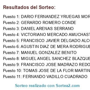 Lista de participantes: FRANCISCO JOSE MADRAZO REDONDO, MANUEL GONZALEZ BENITO, AGUSTIN DIAZ DE MERA RODRIGUEZ, TOMAS JOSE DE LA FLOR MARTIN, DANIEL ARENAS SERRANO, GERARDO ROMERO CONDE, DARIO FERNANDEZ YRUEGAS MORO, FRANCISCO JAVIER DELGADO ALCOJOR, VICTORIANO MERCADO AMUCHASTEGUI, MIGUEL ANGEL SANCHEZ BLAZQUEZ, FERNANDO VADILLO CUADRADO.