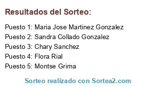 Lista de participantes: Olga Salvadó Bonavida, Paqui Catalan Garcia, Teresa Garcia Soto, Marta de la Cruz, Nagore Arostegui Rojo, Maria Victoria Martos Sanchez, Rinoa Heartilly, Romén Rodríguez Mayor, Anna Balabanova, Sandra Gómez Martínez, Christina Llorens Gomez, Tony Buera, Lidia Leiva Lopez, Poetamar Jaleva, Cintia Soto Saiz, Ivan Monzon Garces, Marta Sancho, Aitziber Fernandez Carmona, Maite Gomez Mazon, Lydia Alie, Paqui Aranda Prosel, Lara Díaz Monllor, Rosa Cruz Ruz, Antonio Meiras Torralba, Carla Meirás Torralba, Boby Gar, Maribel Garcia, Sandra Collado Gonzalez, Francisca Martinez Ouviña, Rosa Maria Cerrejon Galan, Tere Bermudez, Rosa Maria Cocinitas, Leo Haba, Sophia Sanchez Peña, Mari Jose Angulo, Juan Miguel Marcelo Diaz, Toni ARomero, Zulema Pontes Vidal, Toni AC, Geli Peinado Sotoca, Javier Torres Lozano, Antonia Calleja, Antonio Martínez, Marial Cristobal, Beatriz Mena, Ana Isabel Sastre, Isa RH, Nuria Cubero, El Mundo de Netra, Ervaki Porreta, Aurora Hernández, Irene Masip Morte, Maria Ortega Gomez, Ragazza Maria, Montserrat Garcia Garcia, Magdalena Gar Gar, Marimar Montero Romero, Rocio Sanchez Colmenero, Trasgu Astur, Juan Martinez, Angel Mora, Maria Jose Díaz Martínez, Fran Llamas, Mikel Rodríguez, Marisa Peña Sanchez, May Gamundi, Raul Hernandez Rodriguez, Nuri Antón Bravo, Silvestre Benavente Martinez, Katy Martinez Hernandez, Juan Eduardo Benavente Martinez, Silvestre Benavente Macanas, Isabel Gonzalez, Esther Simon Garcia, Lucia Xaica, Si Mon, Raquel MarVel, Dolores Ruiz Ruiz, Mamen Gascon, Carmen Fojon Sierra, Bel Feijoo Fer, Yesii Sanchez, Montse Cunill Gonzalez, Amor Benavides Arias, Maria Fernandez Tor, Sonia Diego, Patricia Saura Sola, Pedro J. Santos, Judith Emsijala, Cleo64 blog, Lola Femenia, Rosa Gs, Chary Sanchez, Yolanda Cantarero López, Rocio Soler Garcia, Maria Jose Rosello, Beatriz González González, Victor Maldonado, Mónica Suárez López, Loli Navarro, Luz Maria, Tania Sanchez, Montse Grima, Pili Laposa Vay, Yolanda Isabel Hurtado Garcia, Raul Asecas, Maria Del Mar Lazaro Cenizo, Natalia Garch, Martamiguelana Beni, Ana Cristina Sanchez Peña, Inma Puertas Esquivel, Pascual Perez Montoya, David Cortes Pastor, Celia Cla Bernal, Teresa Fabregat, Enrique Franco Perez, Richard Brull Leiva, Carlos Brull Leiva, Ana Mari Lopez, Rocío Martínez Monteagudo, Laura Sánchez Murillo, Maria Medina Castillo, Vanesa Delgado Hurtado, Pepita Ortega Barja, Paula Mazariegos Mateos, Maria Isabel Sanchez Medina, Concepción López DEL Castillo, Carolina Saiz, Loli Mulero Tello, Vero Thermococinamix, Beatriz Sanchez, Nieves Cuervo, Mariló Salmerón Fernández, Pilina Blanco Blanco, Roci Fraga, Cielo Figueiredo, Maria Mar Pn, Meritxell Rosique Reixach, Lourdes Jimenez Canela, Angels Afonso Verges, MariaRosa Fdz Lasquetty Blanc, Cris Fdz, María Freire, Pepe BOtella, Julia Losada Barreros, Montserrat Losada Barreros, Maria Martinez, Juan Carlos Téllez Fogué, Maria Jose Urbina Lavin, Ana Espejo, Rosa María Sierra Álvarez, Ronald Rodríguez, Nuria Bueno, Patry Frag Mart, Maria Martinez Blanco, Ra Merino, Araceli Díaz Dueñas, Angelina Fernandez, Cris Puebla, Delgado Yolanda, Conchi Saez Cuesta, Aurora Cuesta Valle, Maria Lourdes Lopez, Nuria Lode, Raquel Martinez Valdes, Isabel Teis Tarinas, Ana Isabel Cano, Carolina Adan, Mariola Certescan, Eva Ortiz Colon, Maria Angeles Roda Lozano, Foam Car Lavadero, Enrique Ruiz G, Amparo Yoldi, Aurora Cf, Sonia Ligero Castro, Cristina Bordetas Agudo, Myriamg Gs, Verónica Nometoques Elkiwi, Mayte FordeOs, Sandra Lopez Fernandez, Luisa Fluixa, Francisco Ramos, Pedro Muñoz Montero, Merche Pacheco, Myriamg Gomez, Mar Con SU Nieto Yeray, Kirah Kuroichi, Pedro Perez Ramirez, Ángel Perez Frai, Cristobal Molino Jimenez, Angeles Caballero, Isabel Aragües, David Pereira Martínez, Antonio GN, Ana Martin, Maya Mayita, Daniel De Lucas Garcia, Mari Rivas, Maria Iluminada Martinez Garcia, Pablo Racionero Romero, Kaloyan Kirilov, Jesus Rodriguez Granado, Jose Luis Gomez, Alberto Vidal, Ilia Nekoki, Da Vid, Ana Maria Ramos Rodriguez, Jose Ramon Gonzalez Ventura, Ana Belen Lopez, Joan Galvez Lanzas, Patricia Villacañas, Pilar Castillo Porras, Mini Torres, Paula Oterino Conde, Manel Quiroga Rius, Barbara Petrioli Gavilán, Gemma Arbós, Jamilie Rodriguez, Javier Jiménez Prieto, Angeles Iglesias, Gema Pavon Fernandez, Encarni Estévez, Marilo Rodriguez Ruiz, Rafa Partida, Jose L U Galarraga, Fina Benavides, Natalia Cuello, Laura Orellana Geladó, Patricia Sanz Pino, Salvatore QR, Inma Menacho, Fina Castejón, Elena Riberas Pérez, Lauro Roman, Gema Paredes Cano, Mariangeles Sales Perales, Maria Jose Lopez Velasco, Esteban Toro, Manuela Morales, Flor de Te, Maitane Ibáñez, Rosa Arroyo, Laura Ezquerra, Iago Leos Sobios, Vanessa Muñiz Alvarez, Itzi Ubillos, Rosa Maria Sanchez, Silvia Sanchez, Francisco Garcia Jimenez, Veronica Sumillera, Angelines Fernandez, Gloria A. Garcia, Antonia Grande Carvajal, Carcele Adolfi, Papeleria Garrido, Maria Prieto, Luz Estelar, Patricia Prieto, Maria Jose Fernandez Lopez, Robledo Rio Sandra, María Del Pilar Arroyo, Maria Asuncion Arias, Alicia Pozo García, Esther Vm, Remedios Cuenca Vidal, Li Dia Lour, Rogelio Gorris Ivars, Eva Trujillo, Rebeca Morales, Ana Bélén Arcos González, Pablo Franco Leiva, Ana Maria Mena Mellado, Ana Badia Mateo, Nieves Liebana de la Red, Carolina Góngora Real, Jennifer Romero, Noelia Rodriguez Freije, Maria Calleja M, Emily Burton, Óscar López, Isidro Rugama A, Emilio Álvarez Rodríguez, Marisa García Sánchez, Mari Crespo, Rogelio Gorris Cuenca, Kapitana Corsaria Pirates, Amparo Valls Clofent, Chelo Moa h, Vanessa Guerrero Peregrina, Julia Ocampo Fernandez, Nicolas Garcia Gelabert, Raquel Velazquez Jimenez, Maite Martin, Maria Valente, Sofia Esther Ruiz Garcia, Aoshi Matsumara, Pilar Prieto Leon, Mara Vaño, Pilar Prieto, Carolina Velázquez Cobo, Encarnacion Gullon Arias, Sofia Terrero, Maria Jose Hadita Labrador Saez, Yolanda Gomez Martinez, Rafael D
