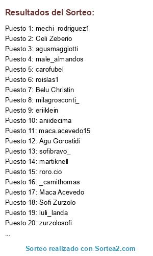 Lista de participantes: Biaan Pino(2 participaciones), Sandra Barrionuevo(3 participaciones), Celi Zeberio(4 participaciones), Belu Christin(5 participaciones), Sofi Zurzolo(2 participaciones), Marcela Christin, Maria Mercedes Ferreyra(3 participaciones), Melisa Zeberio, Anis Perez, Agu Gorostidi(2 participaciones), Diana Mirabelli, Maca Acevedo(8 participaciones), Marcela Ballent, La Petaca de Tandil, caritoiturralde(6 participaciones), maca.acevedo15(4 participaciones), roro.cio, mica.woitiuk, mechi_rodriguez1(7 participaciones), milagrosconti_, martiknell(5 participaciones), agus_ballent, bianpino1(8 participaciones), beluuchristin(5 participaciones), cata_berroeta(6 participaciones), eriiklein(4 participaciones), roislas1(5 participaciones), male_almandos(9 participaciones), camivasquez01, _camithomas, evgutierrez(6 participaciones), zurzolosofi(4 participaciones), quimeyfresco, aniidecima(2 participaciones), carofubel(5 participaciones), luli_landa(5 participaciones), sofibravo_(6 participaciones), perzmili(6 participaciones), agusmaggiotti(7 participaciones).
