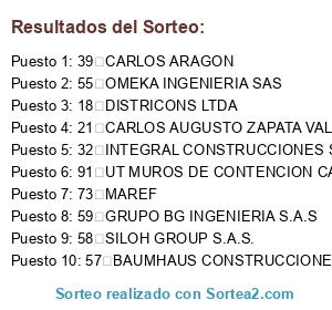 Lista de participantes: 1 BERMUDEZ SAS, 2 ARTURO JURADO ALVARAN, 3 WENTZER MAURICIO LEON TORRES, 4 MONICA LILIANA LOPEZ JIMENEZ, 5 carlos eduardo hernandez valencia, 6 OSCAR ALBERTO GUZMAN TRIVIÑO, 7 ARIETE INGENIERIA & CONSTRUCCION S.A.S, 8 PROCON CP SAS, 9 CONSULTORIA Y CONSTRUCCION ESPECIALIZADA S.A.S., 10 EQUISERVICIOS INDUSTRIALES S.A.S., 11 Jesus Hincapie, 12 CLAUDIA PATRICIA RIOS ORTEGA, 13 GONZAGA VALENCIA HERRERA, 14 Jhoany Alexander Tobon Muñoz, 15 ARQUIND SAS, 16 UAC SAS, 17 MNTY SAS, 18 DISTRICONS LTDA, 19 ANDRES MAURICIO CARDOZO ROA, 20 FERNANDO ARTURO ANGEL PELAEZ, 21 CARLOS AUGUSTO ZAPATA VALENCIA, 22 JHON SANDOVAL, 23 Leodegar Rafael Roys Mejia, 24 HENRY ARCE ARAGON, 25 CONSTRUCCIONES DEL ESTADO INGENIERIA S.A.S, 26 CONSORCIO ADECUACIONES 2025, 27 JAVIER GORDILLO GRISALES, 28 ARMELCO SAS, 29 IP INVERSIONES Y PROYECTOS S.A.S., 30 TOTALPHI SAS, 31 Marva construcciones sas, 32 INTEGRAL CONSTRUCCIONES SAS, 33 SERVIOBRAS LTDA, 34 CESAR ALBERTO MARTINEZ RAMIREZ, 35 JC, 36 GEOCIVILES INGENIERIA SAS, 37 TECNISA S.A.S., 38 AB INGENIERIA S.A.S, 39 CARLOS ARAGON, 40 JORGE SANTAMARIA, 41 CDQ SAS, 42 MIP INTERNACIONAL TRADING SAS, 43 KABOD EXECUTIVE GROUP SAS, 44 INGENIERIA OCIMACS S.A.S, 45 HEOS INGENIERIA & DISEÑO SAS, 46 PROQUING SAS, 47 CITY G&R SAS, 48 LHM CONSTRUCTORES SAS, 49 LUIS CARLOS QUINTERO TORO, 50 VIAYCONS SAS, 51 JEMAD INGENIERIA S.A.S, 52 PROYECTO SANABRIA SAS, 53 NOGARA INGENIERIA, 54 CONSTRUPISOS T.M . SAS, 55 OMEKA INGENIERIA SAS, 56 CONSORCIO SAN MATEO 1, 57 BAUMHAUS CONSTRUCCIONES SAS, 58 SILOH GROUP S.A.S., 59 GRUPO BG INGENIERIA S.A.S, 60 CONSORCIO INFRAMIM, 61 CONSORCIO CONSTRUCCIONES AERONAUTICAS DK9010, 62 SOLUCIONES VIALES DE LA COSTA S.A.S, 63 JAIRO RAMON OROZCO RESTREPO, 64 GRUPO YACAR INGENIERIA S.A.S, 65 CRAM INGENIERIA SAS, 66 GomPro-JLG, 67 CONSORCIO OBRAS JT, 68 CONSORCIO JC, 69 CONSORCIO SAN JUAN, 70 CONSORCIO PUNTOS CRÍTICOS, 71 CONSORCIO ICG 2025, 72 Consorcio MFC, 73 MAREF, 74 CONSORCIO VIAL MR, 75 CONSORCIO AQUACIVIL, 76 CONSORCIO DCYM NAVAS, 77 BAOR 2025, 78 INTERDATPRO, 79 CONSORCIO PRO&NRC, 80 INFINITA - QBK, 81 CONSORCIO MURO CALI, 82 CONSORCIO APOLO 25, 83 EHJJ2, 84 E3-CRESO, 85 CONSORCIO CH, 86 CONSORCIO SEÑALIZAR, 87 CONSORCIO PROYECTOS Y CONSTRUCCIONES, 88 CONSTRUCCIONES CIVILES MRG SAS, 89 CONSORCIO JGC, 90 CONSORCIO PAJUI, 91 UT MUROS DE CONTENCION CALI 2025, 92 CONSTRUCCIONES JR, 93 CONSORCIO MUROS CVL.