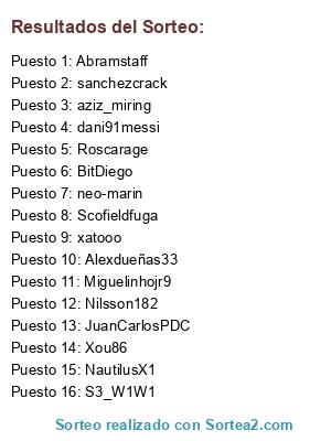 Lista de participantes: Xou86, Scofieldfuga, BitDiego, Alexdueñas33, Nilsson182, sanchezcrack, Roscarage, NautilusX1, Miguelinhojr9, dani91messi, aziz_miring, neo-marin, Abramstaff, JuanCarlosPDC, xatooo, S3_W1W1.
