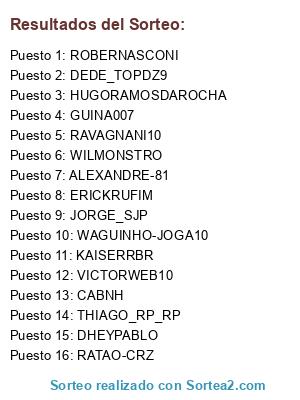 Lista de participantes: ERICKRUFIM, WILMONSTRO, DEDE_TOPDZ9, ROBERNASCONI, GUINA007, DHEYPABLO, JORGE_SJP, HUGORAMOSDAROCHA, THIAGO_RP_RP, ALEXANDRE-81, VICTORWEB10, RAVAGNANI10, RATAO-CRZ, CABNH, KAISERRBR, WAGUINHO-JOGA10.