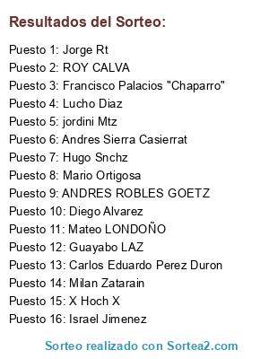 Lista de participantes: Diego Alvarez, Lucho Diaz, Andres Sierra Casierrat, Israel Jimenez, X Hoch X, Mario Ortigosa, ROY CALVA, ANDRES ROBLES GOETZ, Milan Zatarain, Mateo LONDOÑO, Guayabo LAZ, Jorge Rt, jordini Mtz, Francisco Palacios "Chaparro", Carlos Eduardo Perez Duron, Hugo Snchz.