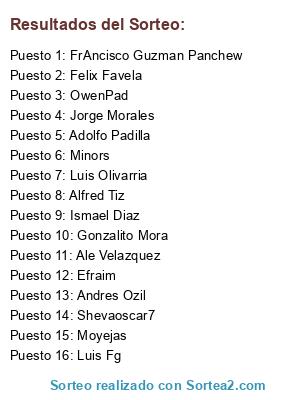 Lista de participantes: Andres Ozil, Alfred Tiz, FrAncisco Guzman Panchew, Shevaoscar7, Luis Fg, Moyejas, Minors, Efraim, Felix Favela, Jorge Morales, OwenPad, Adolfo Padilla, Gonzalito Mora, Ismael Diaz, Ale Velazquez, Luis Olivarria.