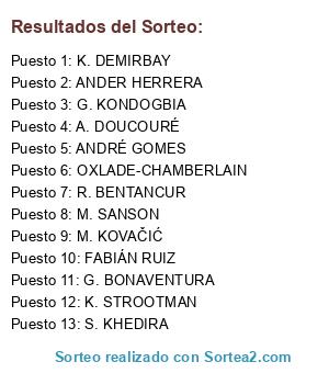 Lista de participantes: K. STROOTMAN, ANDRÉ GOMES, K. DEMIRBAY, G. BONAVENTURA, S. KHEDIRA, M. KOVAČIĆ, ANDER HERRERA, G. KONDOGBIA, OXLADE-CHAMBERLAIN, FABIÁN RUIZ, R. BENTANCUR, M. SANSON, A. DOUCOURÉ.