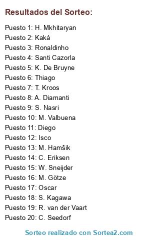 Lista de participantes: M. Götze, Santi Cazorla, Isco, T. Kroos, M. Hamšik, S. Nasri, W. Sneijder, Diego, S. Kagawa, Oscar, A. Diamanti, R. van der Vaart, C. Eriksen, M. Valbuena, Kaká, Ronaldinho, C. Seedorf, K. De Bruyne, H. Mkhitaryan, Thiago.