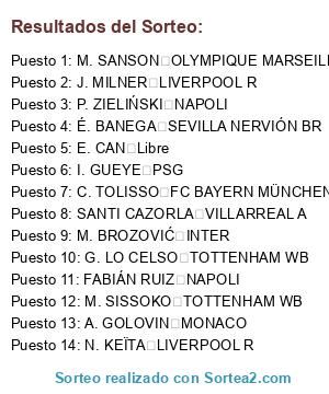 Lista de participantes: N. KEÏTA LIVERPOOL R, M. BROZOVIĆ INTER, É. BANEGA SEVILLA NERVIÓN BR, P. ZIELIŃSKI NAPOLI, E. CAN Libre, A. GOLOVIN MONACO, I. GUEYE PSG, G. LO CELSO TOTTENHAM WB, FABIÁN RUIZ NAPOLI, M. SISSOKO TOTTENHAM WB, C. TOLISSO FC BAYERN MÜNCHEN, J. MILNER LIVERPOOL R, SANTI CAZORLA VILLARREAL A, M. SANSON OLYMPIQUE MARSEILLE.