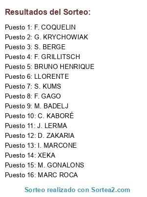Lista de participantes: G. KRYCHOWIAK, I. MARCONE, MARC ROCA, BRUNO HENRIQUE, C. KABORÉ, XEKA, D. ZAKARIA, LLORENTE, M. GONALONS, F. GRILLITSCH, F. COQUELIN, J. LERMA, F. GAGO, M. BADELJ, S. KUMS, S. BERGE.