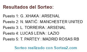 Lista de participantes: L. TORREIRA ARSENAL, T. PARTEY MADRID ROSAS RB, LUCAS LEIVA LAZIO, N. MATIĆ MANCHESTER UNITED, G. XHAKA ARSENAL.