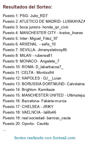 Lista de participantes: CHELSEA - JRIKY, MANCHESTER CITY - kratos_linares, CELTA - Montixx94, SPARTAK DE MOSCU- aemepoam, NAPOLES - DJ__Luian, MANCHESTER UNITED - Ultimatejuanma, ATH.BILBAO - NisteR_69, MILAN - rubenss81, MALAGA- topotencia, BORUSSIA DORTMUND- Calvotainas, ATLETICO DE MADRID- LUISKAYAZA FALTA, PSG- Julio_RD7, VAELNCIA - lalillo46, ROMA- D_labarbacoa7_, ARSENAL - sefis_10, Benfica - guanchu, real sociedad- barroso_ceuta, Brighton- Kamikaze, Heerenveen - reymago11, Oporto- Ceutito, boca juniors- honda_ipr_civic, SEVILLA- Jimenystelrooy85, Barcelona- Fabiete-murcia, Inter- Miguel_Fdez_97, Shaktar Donest- JuanmaZero, Real Madrid- empresariales3, MONACO- Angelete_7, Liverpool- malagueo.