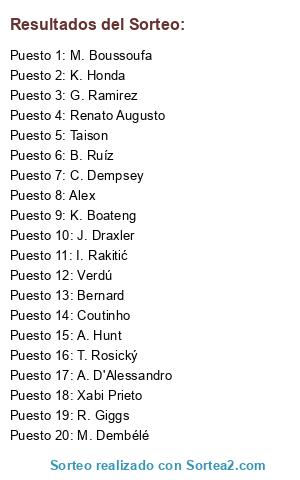 Lista de participantes: K. Honda, K. Boateng, I. Rakitić, M. Boussoufa, M. Dembélé, C. Dempsey, Alex, Bernard, J. Draxler, G. Ramirez, Coutinho, B. Ruíz, Renato Augusto, Verdú, Xabi Prieto, A. D'Alessandro, T. Rosický, R. Giggs, Taison, A. Hunt.