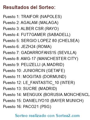 Lista de participantes: DANIELIYO10 (BAYER MUNICH), JEZH24 (ROMA), TRAIFOR (NAPOLES), AGALAM (MALAGA), SUCRE (MADRID), PACO21 (PSG), SERGIO LOPEZ 80 (CHELSEA), AMG-17 (MANCHESTER CITY), PELIZELLI (A.MADRID), LE_FANTASTIC_10 (INTER), ALBER CSR (RAYO), MENGUIX (BORUSIA.MONCHENCLADBACH), MOGITAS (DORMUND), GADARROFANS15 (SEVILLA), JUNIORCIN (GETAFE), FUT7GAMER (SABADELL).