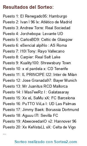 Lista de participantes: l10l Tony: Rayo Vallecano, Panterjack: Villareal, il javi 17: Manchester City, Adrilozano: Atlas de mexico, Mr Juanitus RCD Mallorca, Jorchebopa: Levante UD, Sr Pistolas 86: Juventus, xXxValientexXx: Real Betis, Aguuu l7l: Sevilla FC, BaIIes: Ajax, l Mas7eeRz l : Galatasaray, CarlosBD9: Celtic de Glasgow, eSencial alpiNo : AS Roma, Xx eL SaMu xX: FC Barcelona, Jimmy Baek: Borussia Dortmund, Juanfran333: Malaga CF, IL PRINCIPE I22: Inter de Milan, zZzZ JONA zZzZ: Totteham, Ivan l 96 lx: Atlético de Madrid, AbeeceedariO v2: Hannover 96, x el pardela x: CD Tenerife, Jose Granada97: Bayer Munich, PuTTO ViiLa I: UD Las Palmas, Kuality100: Shrewsbury Town, Xx JoSe 7 xX: Manchester United, Xx KeNstaLL xX: Celta de Vigo, Andrew Torre: Real Sociedad, El Renegado95: Hamburgo, Carpier: Real Salt Lake, BUTR4666: Real Oviedo, Capo Canoneri: UD Almería, BestElTopillo: New York City.