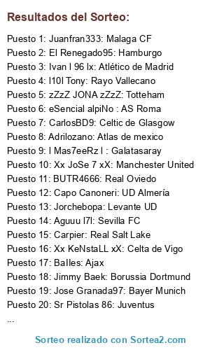 Lista de participantes: l10l Tony: Rayo Vallecano, Panterjack: Villareal, il javi 17: Manchester City, Adrilozano: Atlas de mexico, Mr Juanitus RCD Mallorca, Jorchebopa: Levante UD, Sr Pistolas 86: Juventus, xXxValientexXx: Real Betis, Aguuu l7l: Sevilla FC, BaIIes: Ajax, l Mas7eeRz l : Galatasaray, CarlosBD9: Celtic de Glasgow, eSencial alpiNo : AS Roma, Xx eL SaMu xX: FC Barcelona, Jimmy Baek: Borussia Dortmund, Juanfran333: Malaga CF, IL PRINCIPE I22: Inter de Milan, zZzZ JONA zZzZ: Totteham, Ivan l 96 lx: Atlético de Madrid, AbeeceedariO v2: Hannover 96, x el pardela x: CD Tenerife, Jose Granada97: Bayer Munich, PuTTO ViiLa I: UD Las Palmas, Kuality100: Shrewsbury Town, Xx JoSe 7 xX: Manchester United, Xx KeNstaLL xX: Celta de Vigo, Andrew Torre: Real Sociedad, El Renegado95: Hamburgo, Carpier: Real Salt Lake, BUTR4666: Real Oviedo, Capo Canoneri: UD Almería, BestElTopillo: New York City.