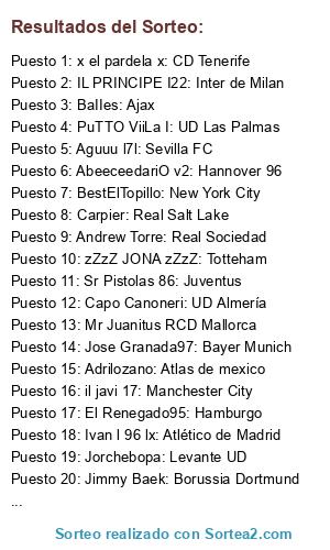 Lista de participantes: l10l Tony: Rayo Vallecano, Panterjack: Villareal, il javi 17: Manchester City, Adrilozano: Atlas de mexico, Mr Juanitus RCD Mallorca, Jorchebopa: Levante UD, Sr Pistolas 86: Juventus, xXxValientexXx: Real Betis, Aguuu l7l: Sevilla FC, BaIIes: Ajax, l Mas7eeRz l : Galatasaray, CarlosBD9: Celtic de Glasgow, eSencial alpiNo : AS Roma, Xx eL SaMu xX: FC Barcelona, Jimmy Baek: Borussia Dortmund, Juanfran333: Malaga CF, IL PRINCIPE I22: Inter de Milan, zZzZ JONA zZzZ: Totteham, Ivan l 96 lx: Atlético de Madrid, AbeeceedariO v2: Hannover 96, x el pardela x: CD Tenerife, Jose Granada97: Bayer Munich, PuTTO ViiLa I: UD Las Palmas, Kuality100: Shrewsbury Town, Xx JoSe 7 xX: Manchester United, Xx KeNstaLL xX: Celta de Vigo, Andrew Torre: Real Sociedad, El Renegado95: Hamburgo, Carpier: Real Salt Lake, BUTR4666: Real Oviedo, Capo Canoneri: UD Almería, BestElTopillo: New York City.