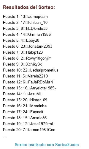 Lista de participantes: 1 JesuML, 2 Rowy10gonjim, 3 Halop123, 4 Eboy20, 5 Varela2210, 6 FaJaRDoMaN, 7 fernan1981Con, 8 hEDlondo33, 9 Xchiky3x, 10 Xou86, 11 Jjose84, 12 Jose1979rml, 13 aemepoam, 14 Ginman1986, 15 Ansale86, 16 Anyelote1985-, 17 Ichiban_10, 18 Soccatala73, 19 T_chico_T, 20 Nister_69, 21 Mominha, 22 Lethalprometius, 23 Jonatan-2393, 24 Faynait.