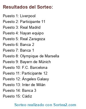 Lista de participantes: Ángeles Galaxy, Olympique de Marsella, Real Zaragoza, Bayern de Múnich, Cádiz, Real Madrid, Nayan equipo, Liverpool, F.C. Barcelona, Inter de Milán, Participante 11, Participante 12, Banca 1, Banca 2, Banca 3.