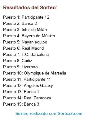 Lista de participantes: Ángeles Galaxy, Olympique de Marsella, Real Zaragoza, Bayern de Múnich, Cádiz, Real Madrid, Nayan equipo, Liverpool, F.C. Barcelona, Inter de Milán, Participante 11, Participante 12, Banca 1, Banca 2, Banca 3.