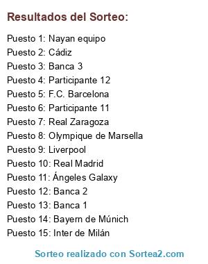 Lista de participantes: Ángeles Galaxy, Olympique de Marsella, Real Zaragoza, Bayern de Múnich, Cádiz, Real Madrid, Nayan equipo, Liverpool, F.C. Barcelona, Inter de Milán, Participante 11, Participante 12, Banca 1, Banca 2, Banca 3.