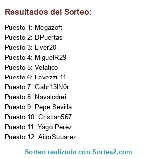 Lista de participantes: Megazoft, MiguelR29, Velatico, Cristian567, Lavezzi-11, Dpuertas, AitorSuuarez, Liver20, Navalcdrei, Gabr13lN0r.