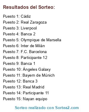 Lista de participantes: Ángeles Galaxy, Olympique de Marsella, Real Zaragoza, Bayern de Múnich, Cádiz, Real Madrid, Nayan equipo, Liverpool, F.C. Barcelona, Inter de Milán, Participante 11, Participante 12, Banca 1, Banca 2, Banca 3.