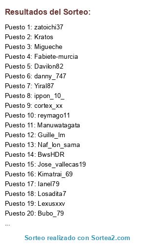 Lista de participantes: Oladipo097, Ianel79, Kratos, Jose_vallecas19, Yiral87, Jorgitoceuta, Guille_lm, Lexusxxv, Kimatrai_69, Manuwatagata, cortex_xx, Bubo_79, BwsHDR, Tu_du3nd3_, danny_747, Fabiete-murcia, GarryPes, Losadita7, Naf_lon_sama, zatoichi37, Davilon82, Migueche, reymago11, ippon_10_.