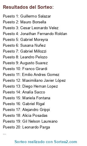 Lista de participantes: Abigail Ticona, Adam Husein, Adrian Alejandro Moreno, Adrián Ramundo, Alejandra Rodriguez, Alejandra Sandoval, Alejandro Di Vagno, Alejandro Fabricio Rosales, Alejandro Gauto, Alejandro Grippi, Alfonso Esteban Valenzuela, Alicia Posadas, Ana Gilligan, Ana Mancuso, Ana Quintiero, Anabella Prego, Analia Molina, Analia Pedulla, Analía Sacco, Andrea Guiraldi, Andrea Tejero, Andrea Zamudio Delucchi, Andrés Orellana, Angel Calvo, Angelo Paillanao Omar Bravo, Ariel Simanovich, Arnaldo Speranza, Atilio Raimondi, Augusto Napoli, Augusto Suarez, Axel Rodriguez, Berenice Grottasanta, Brenda Caramelo, Brian Iele, Carla Sosa, Carlos Alberto Sosa, Carlos Apaolaza, Carlos Esteban Rodriguez, Carlos J. Rivera, Carolina Núñez, Carolina Olivera, Cecilia Beltran, Cecilia Gencarelli, Cecilia Myriam Castro, Cecilia Petta, César Fabián Bustos, Cesar Leonardo Espinosa, Cesar Leonardo Velez, Cesar Martinez, Christian Adrian Pesoa, Christian Valesio, Cinthia Leguizamon, Claudia Massera, Claudio Bustos, Claudio Leonardo Caruso, Cristian Dario Gutierrez, Cristian Hernan Medina, Cristian Javier Cañete, Cristian Spadoni, Cristian Zielony, Cynthia Machado, Daiana Maydana, Damian Ricardo Acevedo, Daniela Gonzalez, Dante Diaz, Darío Emiliano Escobar, Dario Gallardo, Darío Salas, David Castillo, David Faur, Diego Catalano, Diego Fidalgo Alvite, Diego Gonzalez, Diego Hernan Lopez, Diego Saravia, Diego Serale, Diego Tucci, Diego Ysnardez, Eduardo Arrieta, Eleonora Rivas, Eliana Gianoli, Elizabeth Pineda, Emilio Andres Gomez, Emilio Torrico, Emilio Van Houtte, Ernesto Alli, Ernesto Orta, Esteban Dauria, Esteban Rodriguez, Ezequiel Coronel, Fabian Astudillo, Federico Stilman, Fernando Castoldi, Fernando Gabriel Ismael, Fernando Pietronave, Fernando Poretti, Filomena Bellesi, Flavia Elizabeth Vallejos, Flavia Hidalgo, Florencia Baccaro, Florencia Coronel, Florencia De Luca, Florencia Mereles Pedrozo, Franco Colombo, Franco Girardi, Gabriel Adamoli, Gabriel Millozzi, Gabriel Moreyra, Gabriel Rigal, Gabriel Ruiz Diaz, Gabriela Gattoronchieri, Gabriela Gauna, Gabriela Otazo, Gabriela Rocío Rodríguez, German Burini, Germán Vallejo, Gil Nelson Laureano, Gisela Muguruza, Gonzalo Siddig, Graciela Scaramuzzo, Guido Luppino, Guido Waimberg, Guillermo Marchese, Guillermo Martinez, Guillermo Salazar, Gustavo Escobar, Gustavo Garcia, Gustavo González, Gustavo Loza, Héctor Fernández, Hernán Albanesi, Hernan Dario Oviedo, Hernan Di Carlo, Hernan Popok, Hugo Ernesto Amaya, Ines Quintiero, Isabel Chaile, Javier Alejandro Torres, Javier Cáccamo, Javier Cotroneo, Javier Cupeiro, Javier Krenz, Javier Pecyner, Javier Robledo, Joaquín Valdés, Johana Peñalba, Jonathan Fernando Roldan, Jonathan Javier Pelozo, Jorge Arregui, Joselina Elías, Juan Cruz Rasso, Juan Pablo Ismael, Juana Liliana Alvis, Julian Pereira, Julio Cesar Benitez, Kropyvyanskyy Fylypp, Laura Rodriguez, Laura Vazquez, Leandro Daniel Melluso, Leandro Giusti Yarozzi, Leandro Pelozo, Leonardo Alfaro, Leonardo Bordaverri, Leonardo Daniel Pascual, Leonardo Omar Paez, Leonardo Parga, Lilian Villalba, Liliana Andrade, Lorena Sanchez, Lucas Horvath, Lucia Mancuso, Lucia Quintero, Lucio Coppola, Luis Aranda, Luis Hector Beltran, Magali Lago, Manuel Perito, Marcela Rey, Marcelle Lefineau, Marcelo Cestaro, Marcelo Curbelo, Marcelo Galluzzo, Marcelo Gomez, Marcelo Guerrero, Marcelo Quijano, Maria Belen Sanabria, María Carolina Pepe, Maria Ceresito, Maria Elena Susman, María Fernanda Rezza, Maria Jose Mantello, María Laura Sosa Vives, María Pereyra, Maria Rosa Molina, Mariana Lucia Torres, Mariana Merani, Mariano Acuna, Mariano Camilli, Mariano Pellizzer, Mariela Carrizo, Mariela Fontana, Mariela Paulillo, Martin Cravero, Martin Devalle, Martin Gabriel Portogallo, Martin Pereira, Martin Raul Rodriguez, Matias Damian Quiroga, Matias Prociuk, Mauro Borsella, Maximiliano Javier López, Melina La Forgia, Melisa Chetto, Micaela López, Miguel Angel Blanco, Miguel Spinelli, Mirian Sosa, Natalia Caceres, Natalia De Matteo, Natalia Kurlanz, Natalia Mancuso, Natalia Taddei, Nazarena Talice, Nestor Alberto Godoy, Nicolas Giardino, Nicolas Pellegrini, Pablo Ezequiel Benegui, Pablo Hernan Suarez, Pablo Julián Rabotnikof, Pablo Kralj, Pablo Mariano, Pablo Omar Septur, Patricia Otero, Paula Averza, Paula Clavin, Paula Reyna Gonzalez, Paula Zucchello, Paulina Pilatti, Priscila Ures, Ramiro Barcia, Ramiro Barrionuevo, Raul Britos, Raúl Sosa, Ricardo Lerin, Roberto Garay, Rodrigo Sanchez, Romina Berardi, Romina Regueira, Roxana Chapoñan, Ruben Emilio Cruz, Samanta Sena, Sebastian Azamé, Sergio René Leali, Silvana Marina Vose, Stella Maris Bustorf, Susana Nuñez, Teresita Romero, Ulises Romero, Vanina Medinas, Veronica Loza, Veronica Rachelli, Victor Babuya, Victoria Marsicano, Virginia Nípoli, Viviana Mariel Molina, Viviana Miszczuk, Walter Cabrera Hornos, Walter Martinez, Ximena Careri, Yesica Gutierrez.
