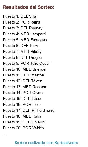 Lista de participantes: POR Julio Cesar, POR Buffon, POR Valdés, POR Reina, POR Akinfeev, POR Adler, POR Lloris, POR Given, POR Cech, DEF Vidic, DEF Lucio, DEF Maicon, DEF Lahm, DEF Terry, DEF Dani Alves, DEF Chiellini, DEF R. Ferdinand, MED Iniesta, MED Xavi, MED Robben, MED Lampard, MED Kaká, MED Sneijder, MED Ribéry, MED Gerrard, MED Fábregas, MED Xabi Alonso, DEL Villa, DEL Rooney, DEL Drogba, DEL Forlán, DEL Diego Milito, DEL Tévez, DEL Fernando Torres, DEL Arshavin.