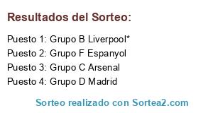 Lista de participantes: Grupo A Roma, Grupo B Liverpool*, Grupo C Arsenal, Grupo D Madrid, Grupo E Spurs*, Grupo F Espanyol, Grupo G Sevilla.