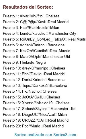 Lista de participantes: Fx//Nacho Chelsea, C@iP@r//Xavi Real Madrid, Xperto//Ibisevic19 Chelsea, DiegoUC//NicoAzul Milan, RoOnEy_Gb//Leo_FalcaO Real Madrid, Eco//Blackbuick Milan, Fbn//Daviid Real Madrid, Maur0//Opti Manchester Utd., Dark//Katooh Barcelona, kendo//klaudiio Manchester City, KezOn//Camilo! Real Madrid, Topo//DarkoxZ Barcelona, Fco//Mario Real Madrid, dreyk0//monipo Chelsea, CROZZ//CAT Real Madrid, Herlast// Negro, JoOtA*C//JL Chelsea, Sebas//Skyline Machester Utd., Adrian//Tatann Barcelona, Alvarilloh//fito Chelsea.